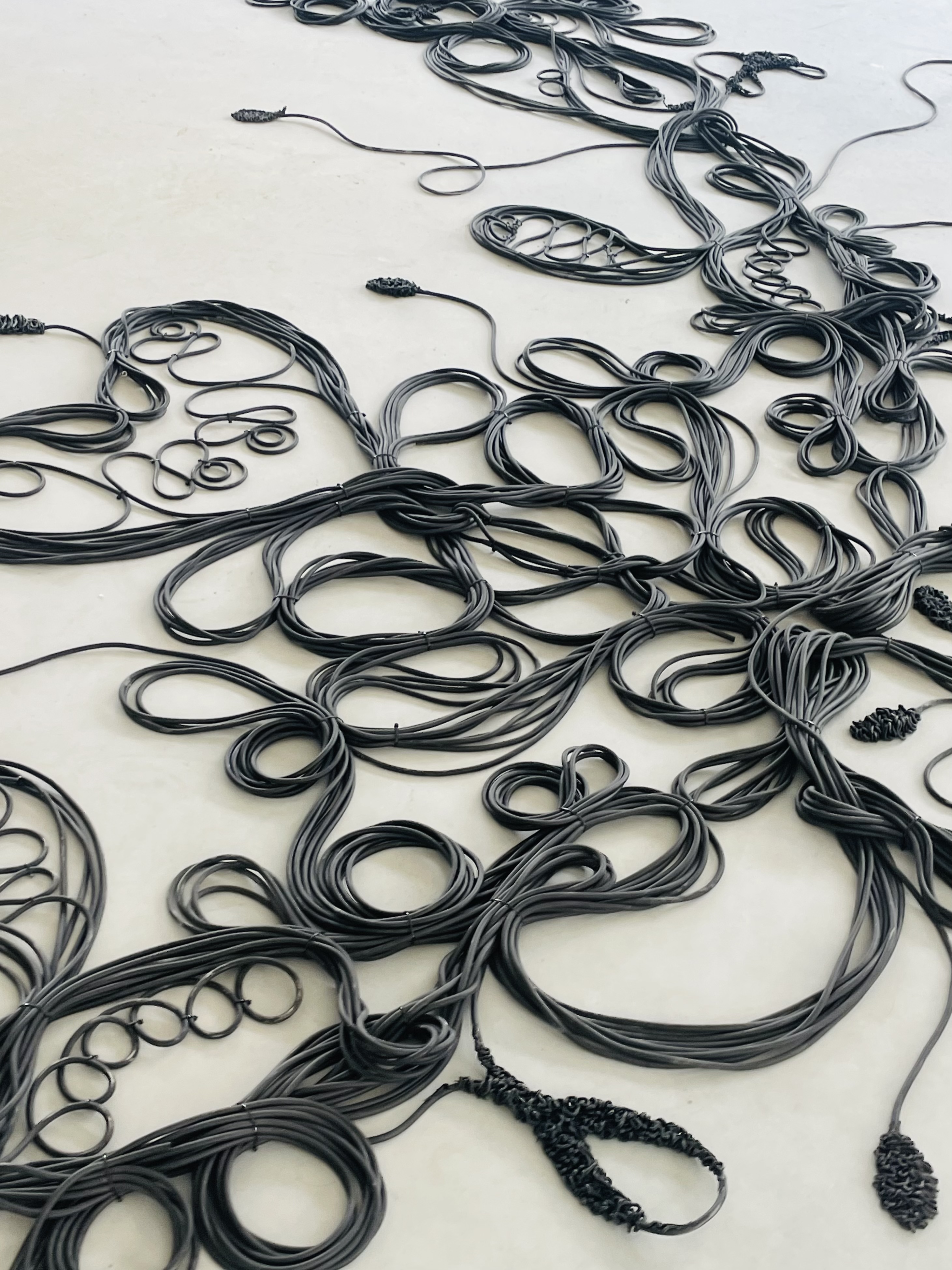 The installation is a mixed-media work comprising a looping video essay, a research booklet with screenshots from Chadegan, the place where my grandfather grew up and a sculptural cable carpet. Referencing Persian ornamentation, the black cables trace a fragile digital network across the floor, navigating memory, longing, and the invisible boundaries of belonging.