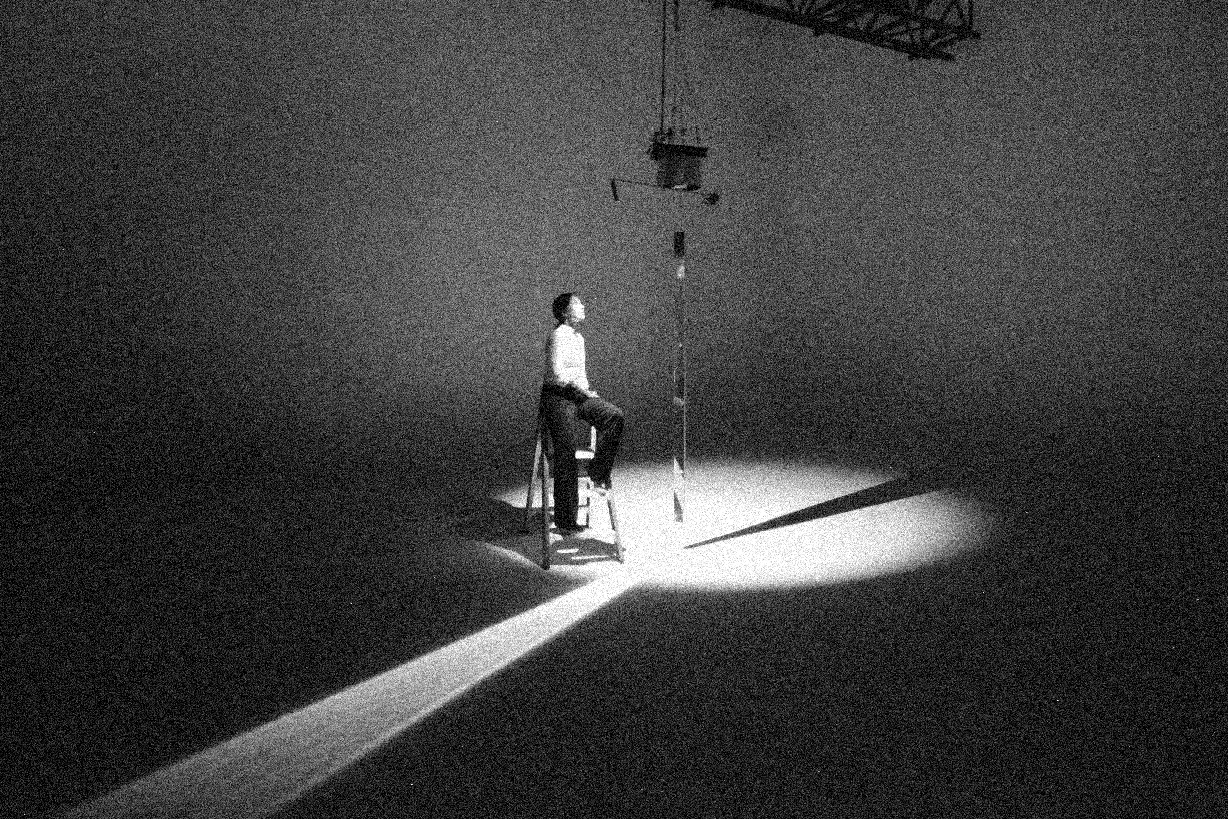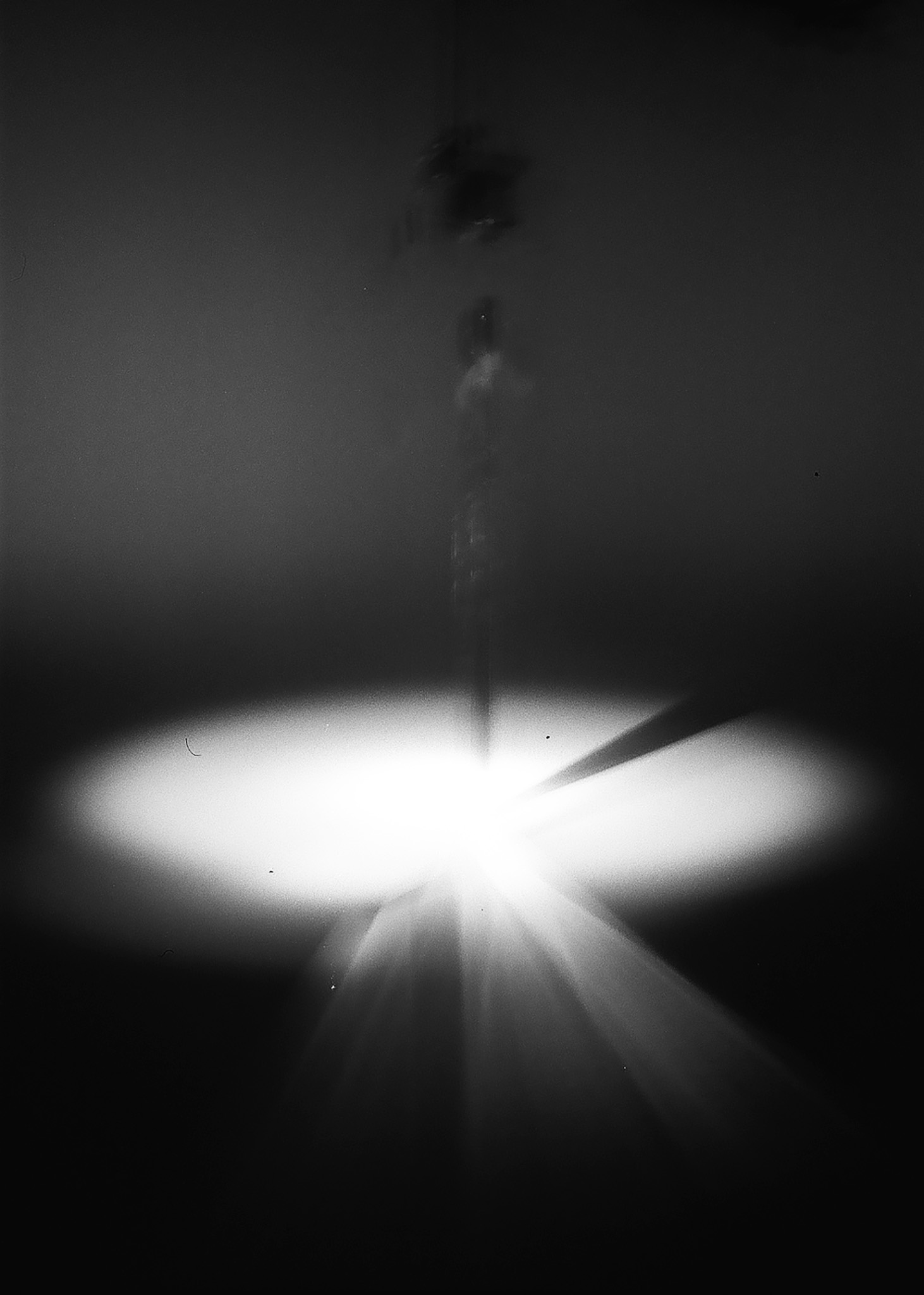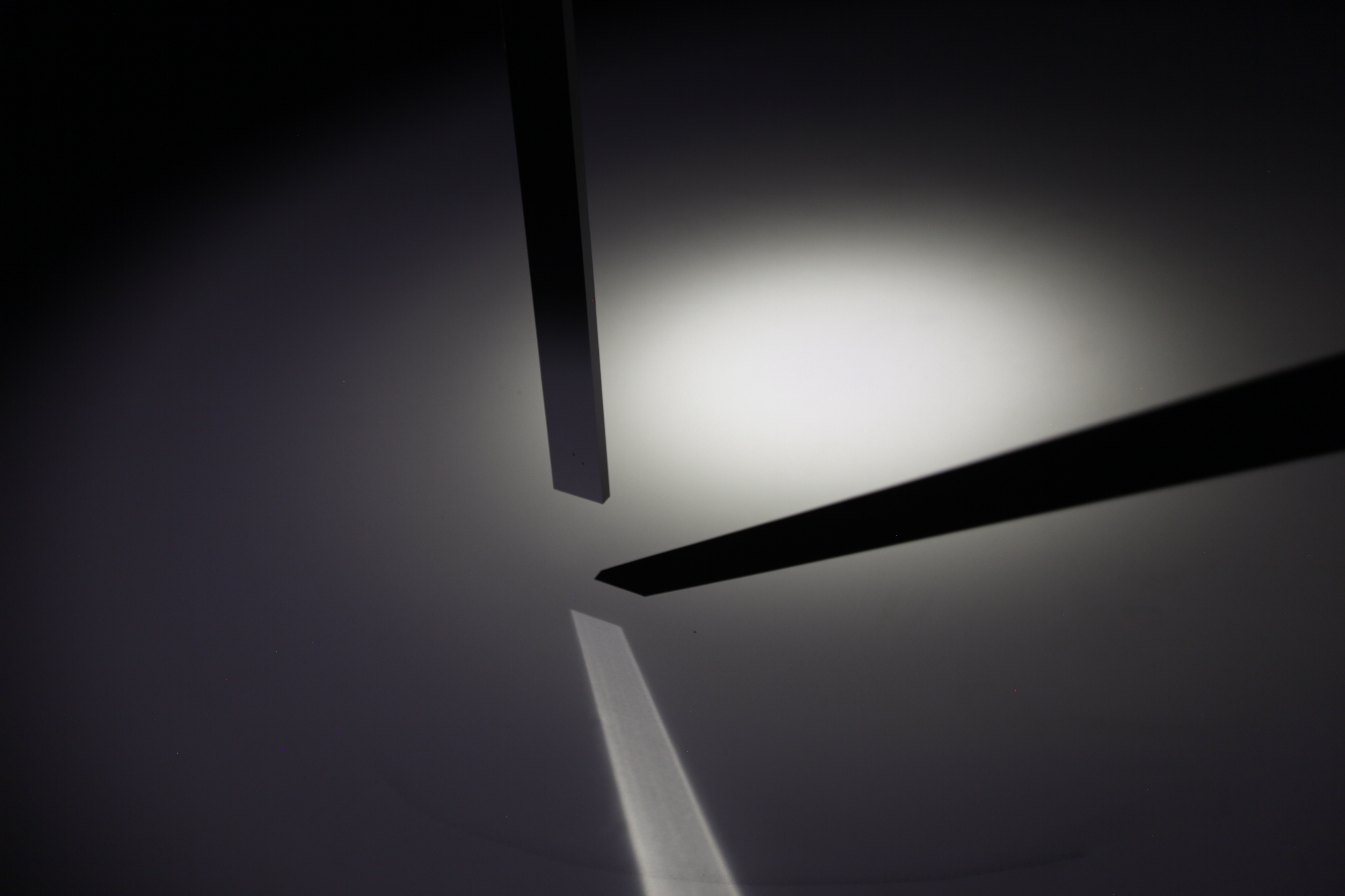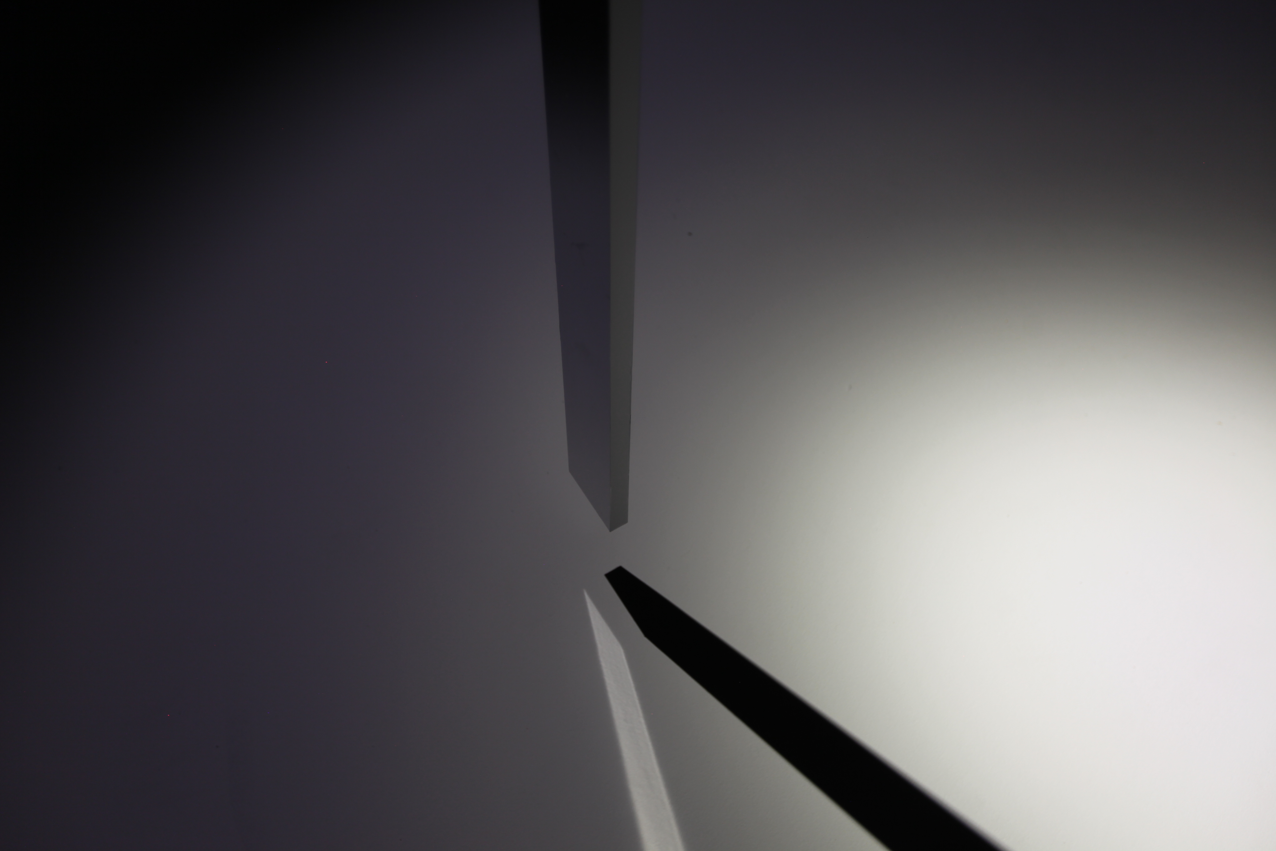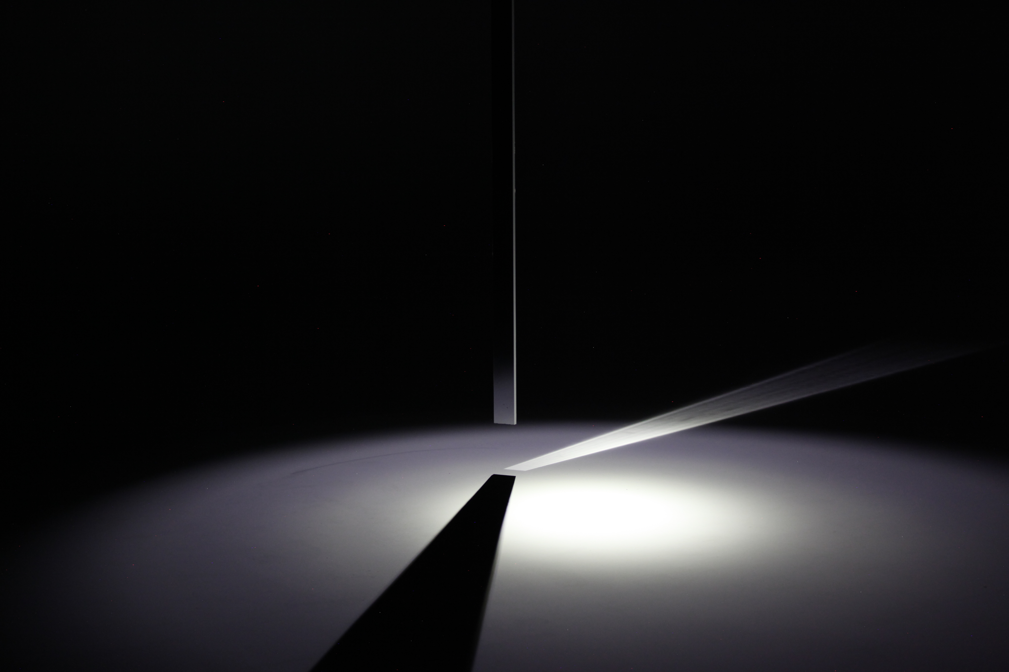 A beam of light meets the mirrored rod, casting a reflection and a shadow that glides across the ground, in an asynchronous dialogue.